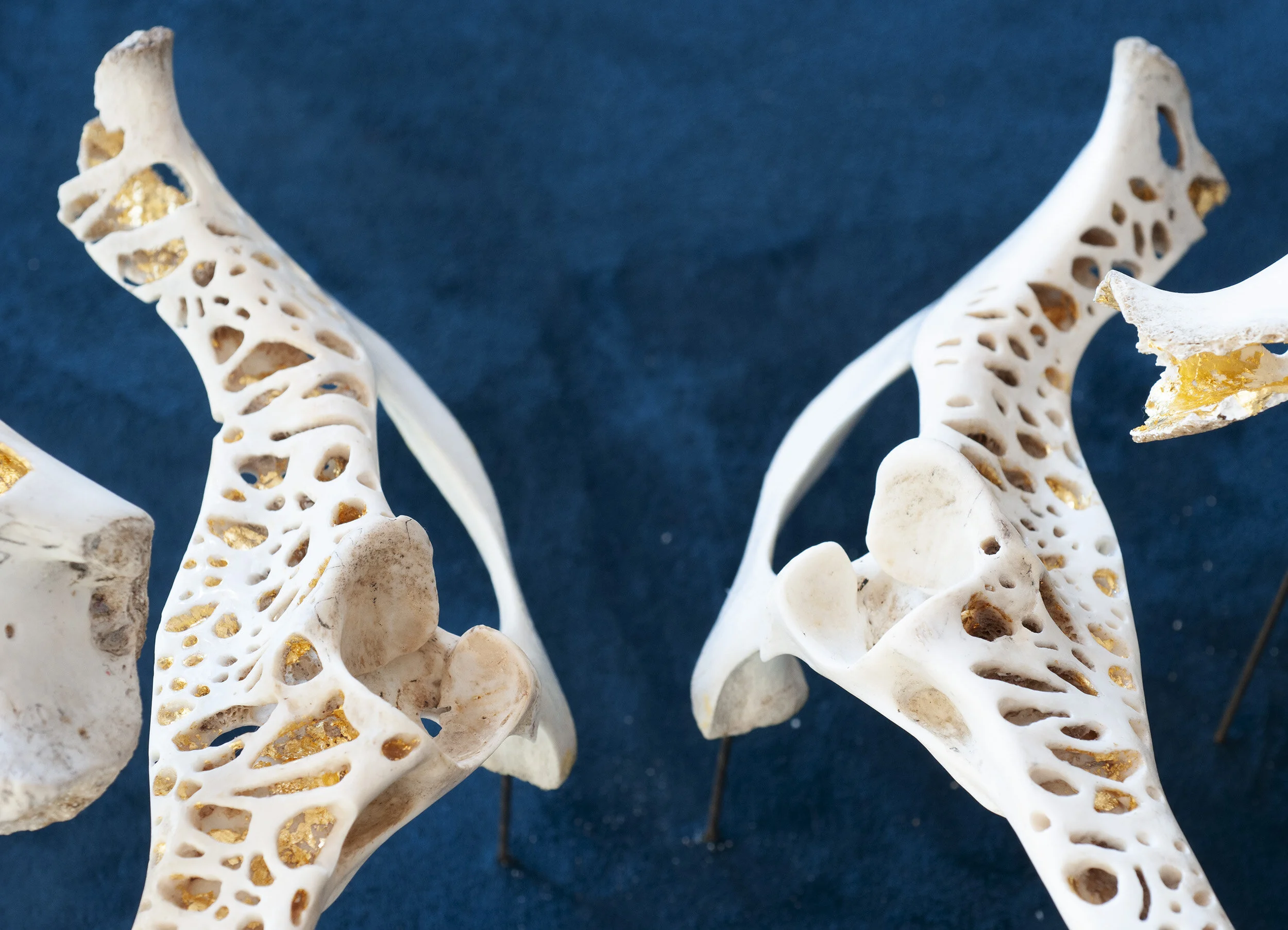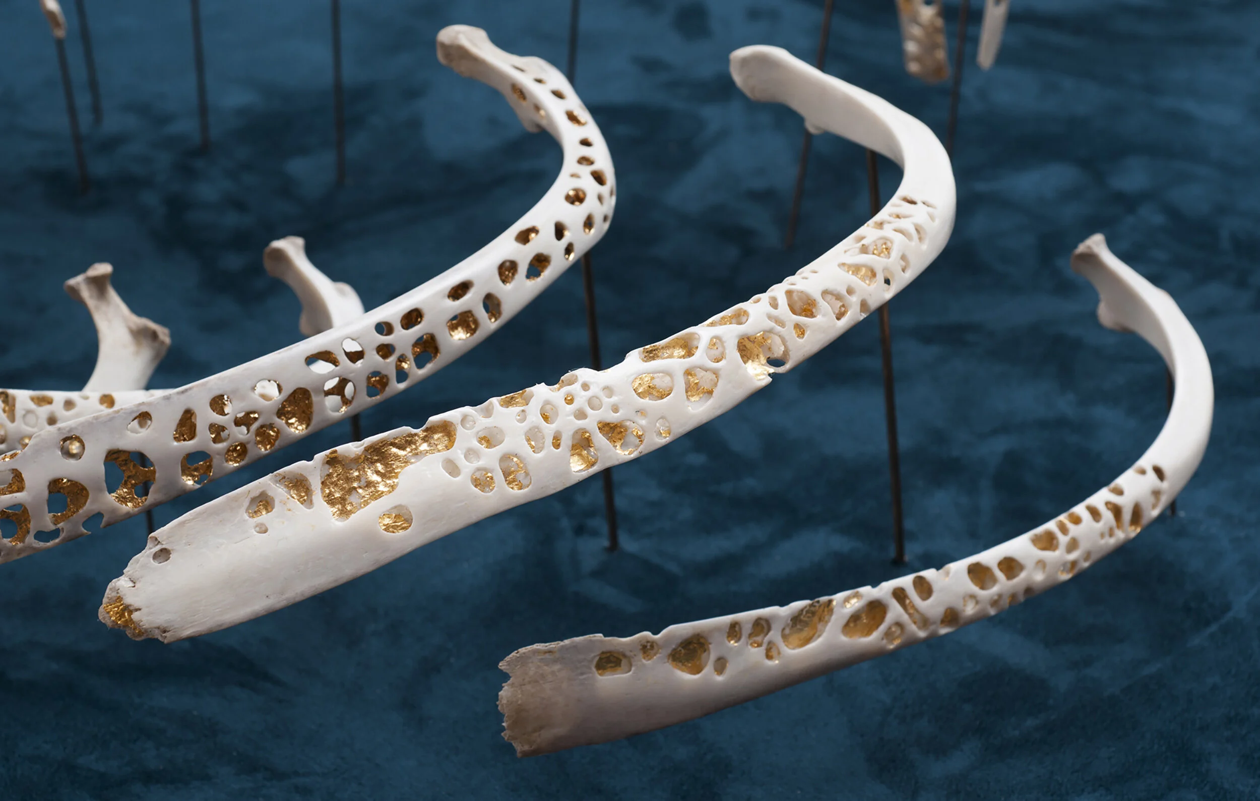 Year round, the highways and roadsides near my home in Central Iowa are littered with road kill. In the early spring I walk creek beds and ditches to retrieve their bones washed away and cleaned by vultures and insects. Using my hands and sandpaper I polish the bones to a porcelain shine and then engrave an image of a lacy network onto their surface. With a jeweler’s tool, I carve the bones and remove the marrow from their core. Once hollow and clean I gild the internal chamber with 24 karat gold. I am building a precious relic of something silent and wild that lives and dies by our agriculture, our economies, and our speed.