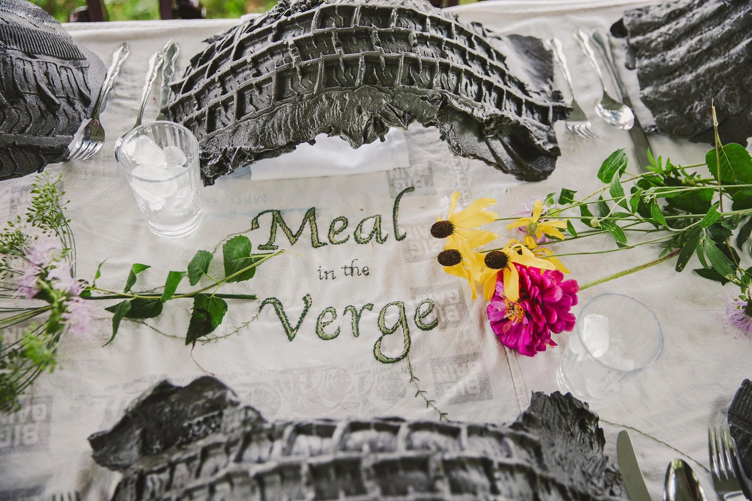 This ongoing project is a series of meals hosted on public land beside highways. At each gathering, guests are guided to this untended wild space to dine at a table set with iron plates cast from tires and deer teeth. The food served is foraged or grown locally, often in unexpected places. Participants are invited to share stories about their experiences with roadkill and wildlife in a space that is controlled, wild, dangerous, and beautiful.