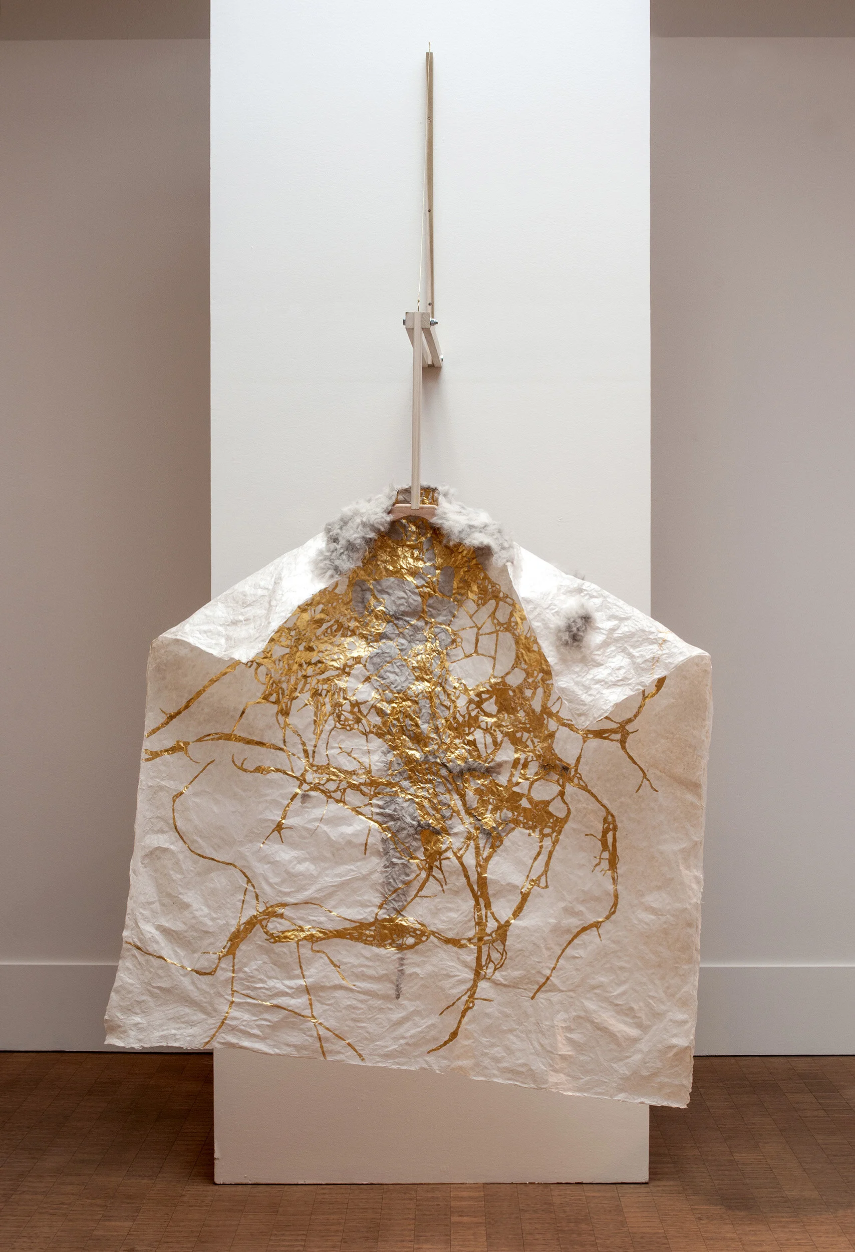 This five foot square sheet of paper is the width of my reach and the height of my body. It is coated in gelatin made from animal hoofs and bones. When dry, the surface is polished, making the paper strong — similar to parchment. Plant root systems are projected and then traced onto the surface, and then gilded in 24 karat gold. The drawing is then cast over my shoulders to fit my body.