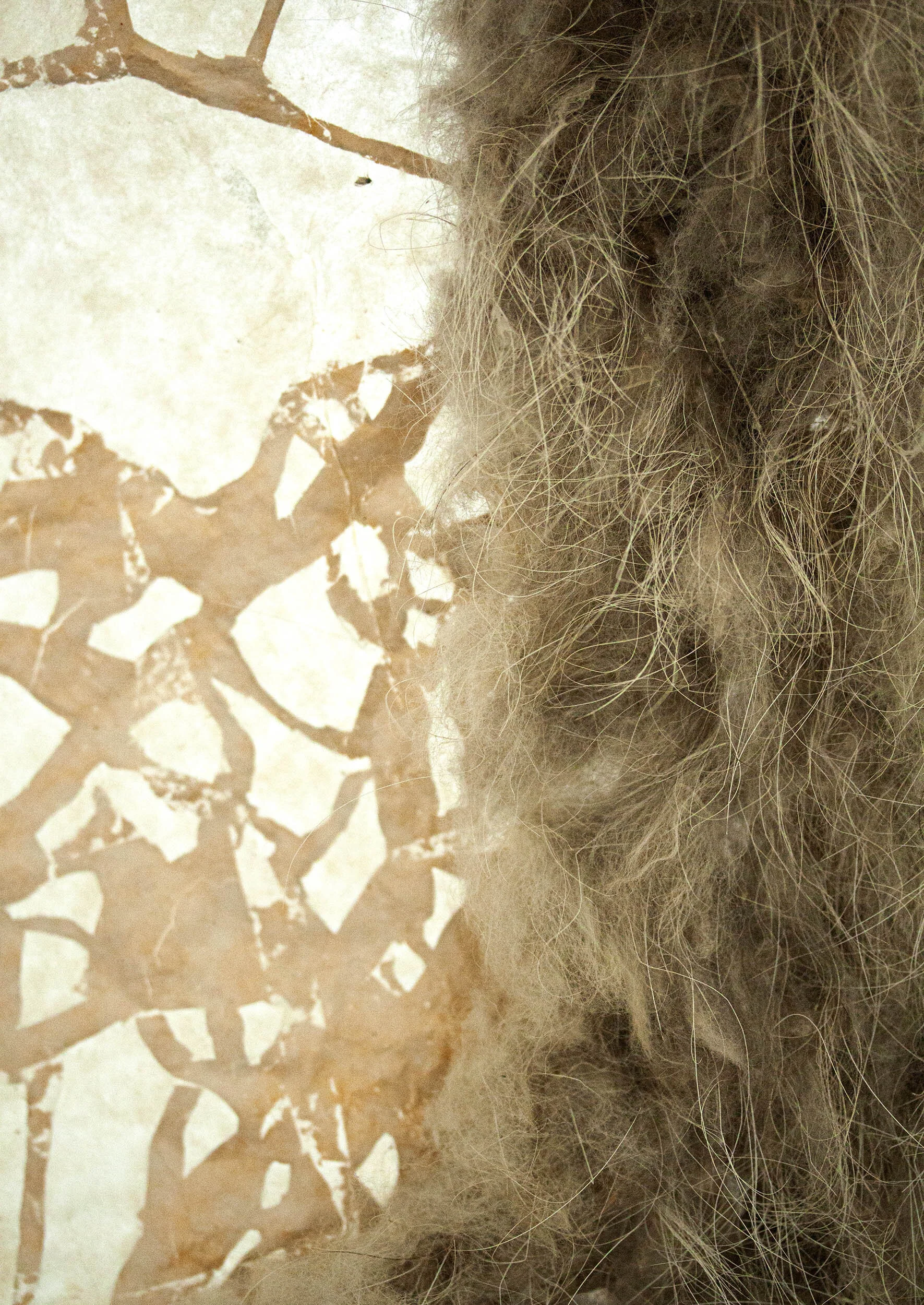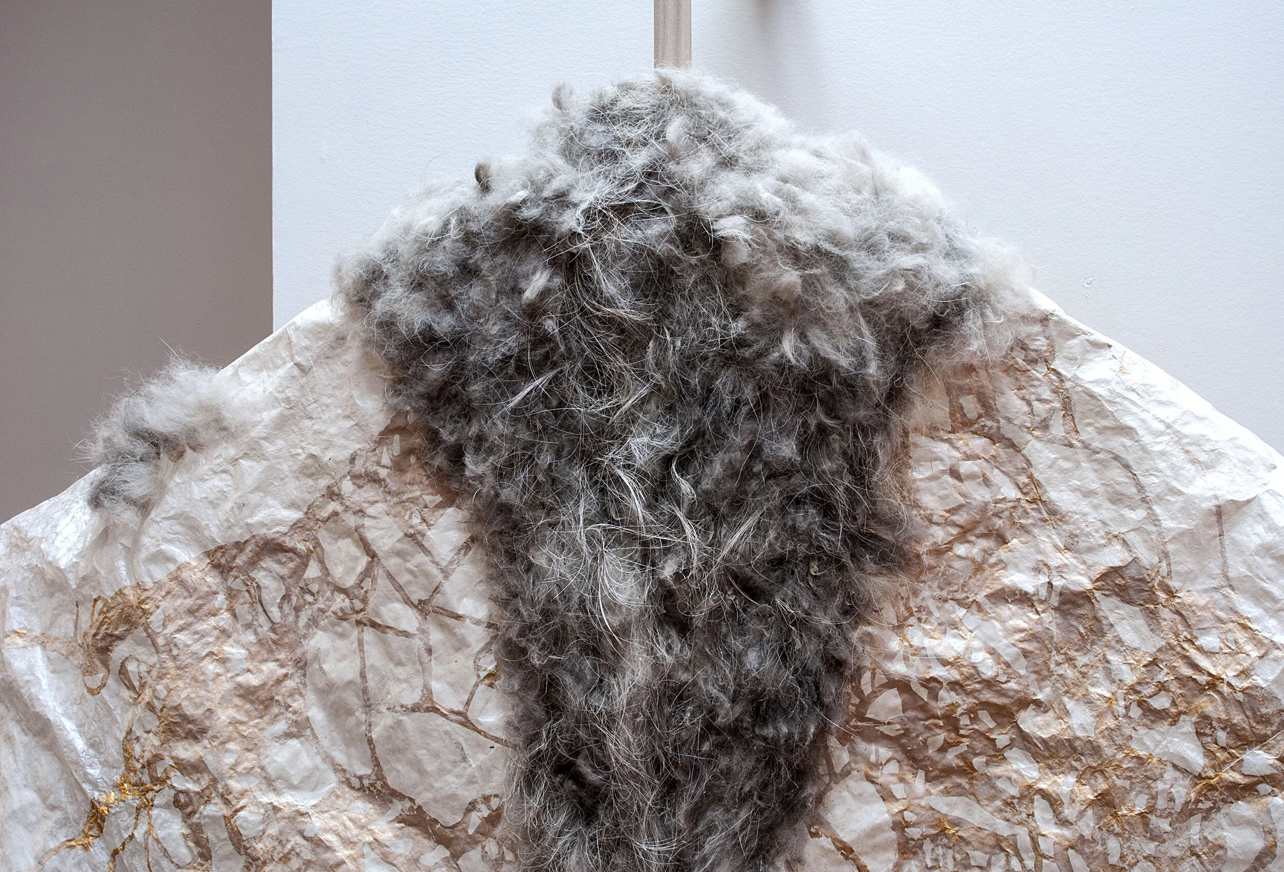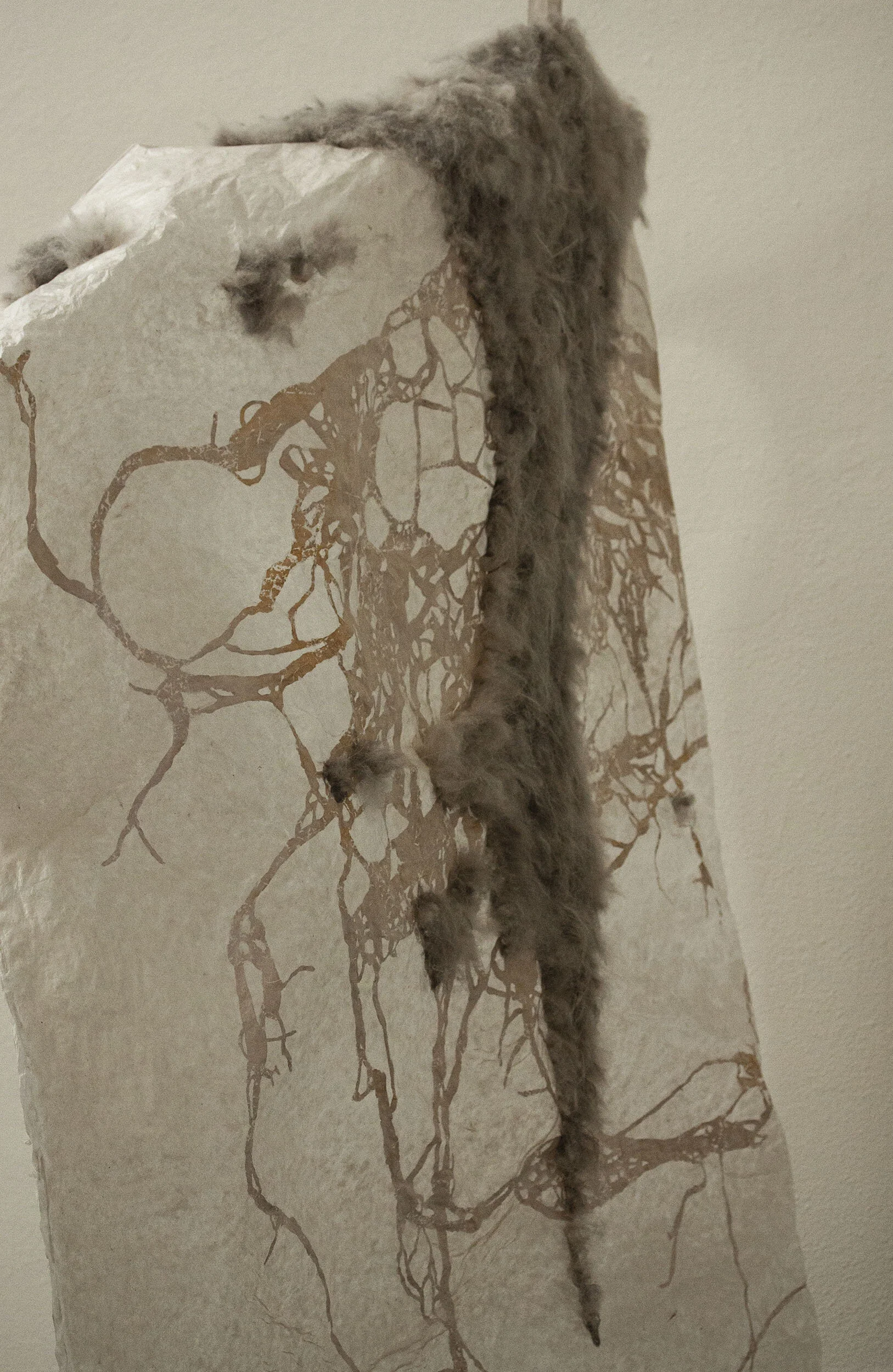 Handmade paper, gelatin, wolf fur, carved wooden hanger